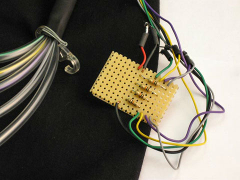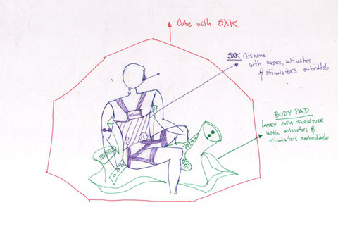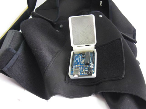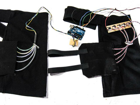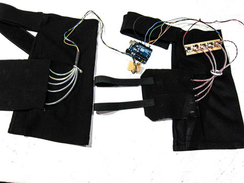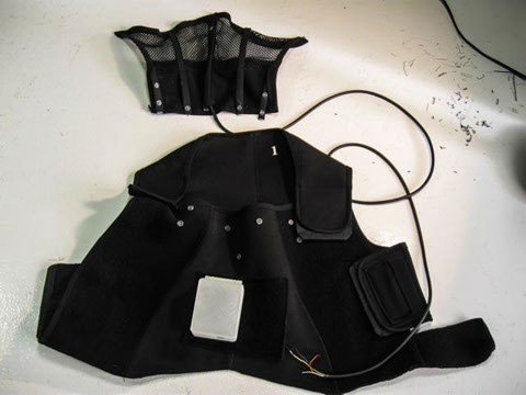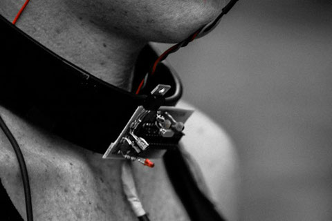 This exoskeleton is not based on the bones/muscles structure, but on the relational structure of the body. Here, there is no metallic mechanism multiplying the force, but a second sensual and communicative skin. The suit integrates some devices on classic PCB (shape and size adapted) and some other ones on soft-circuit, printed directly on the suits material.